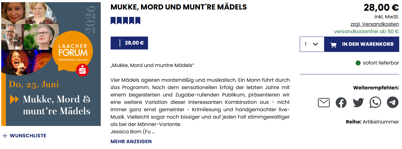 Mukke: Jessica BornMord: Isabella Archan, Andrea Revers und Susanne ArnoldModeration: Ralf KrampZu den Tickets geht es bei Klick auf das Bild:
